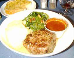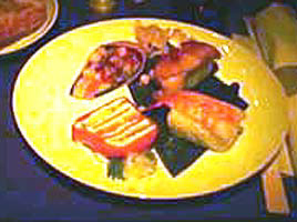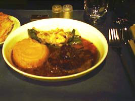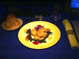 | 食事は一回。迷わずビーフを頼んだ。ストロボを使わなかったので奇麗にお見せできないのが残念ですがアペリティフの貝柱は妙にお洒落な盛りつけでした。黄色の部分が白いと思って下さい。 |