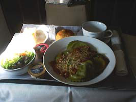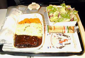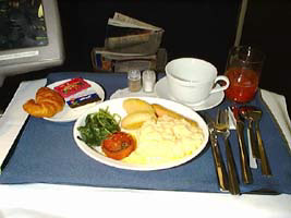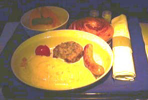 | 相変わらずBKK線は満席だ。食事はスクランブルエッグをチョイス。写真じゃ分らないけどタマゴの中にベーコンが隠れている。 |