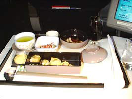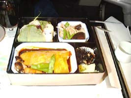 | 食事は久し振りに幕の内弁当を頼んでみた。最近は怖い物見たさで弁当以外が多かったのだな。JFK線の弁当はマンハッタンにある「NIPPON」ていう日本食屋が作っている。がLAX線はどこなんだろう? |