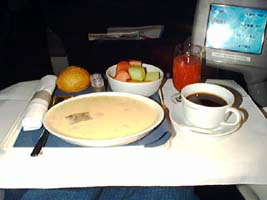 | 到着前の食事はお気に入りのベーコンチャウダー。ヨーグルトを手に入れるためにはフルーツプレートなんだけど。スープも捨てがたかった。 絵を良くするためにまずい(人によります)コーヒーも頼んだわよ。 |