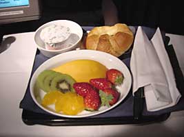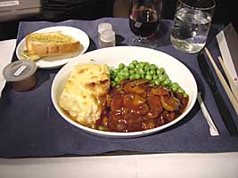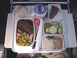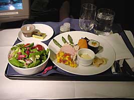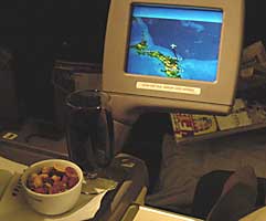 | これで生まれて初めての747-400のエコノミープラス。通常のエコノミーよりは広い。確かに広い。(ほんのちょびっと)でもそこはエコノミー。時間が来れば民族移動も始まるし。時間が来ればフリスビー大会も始まる。もちろんあちらこちらで窓が開いたり閉まったりで、アナログのライティングエフェクト(分らない人はPhotoshopを買うこと)だな。 |