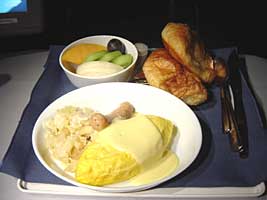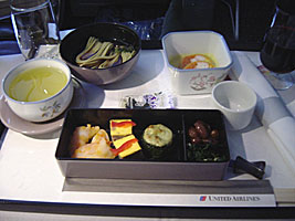 | 次はUA1717。目的地が目的地なので朝からちょいとワインなど。なんか来るときも食べたような。 |