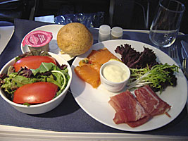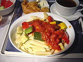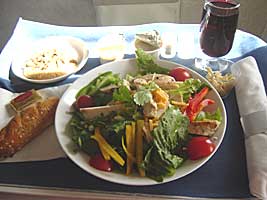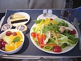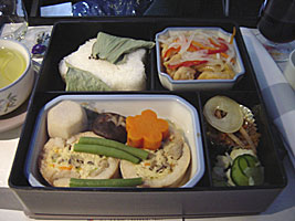 | 機内はFCYフル。 この路線どうもCAがバタバタしてる。段取も悪そう。 何時もは1Kからミールのオーダーを取りに来るのだが今回は1Kである僕が最後。 これはと思い試しに「BENTO」をオーダーしてみた。案の定「あいにく弁当は切れてしまいました」だと。見越していたので出てきたものを食べる。 |