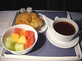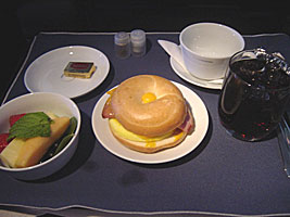 | 映画を見ながら食事をし、Just for laughs(お笑いいたずらパントマイムですな)を見ながら周囲を気にせず爆笑し、仕事モード。 仕事が一段落すると昏睡状態。気が付くと到着1時間半前。 |