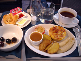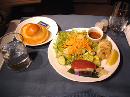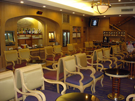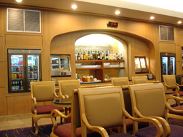 | 出国後、まずはレッドカーペットへ。ツナサンドつまんでタバコ吸って時が来たのでお隣へ引っ越し。3倍の広さに2倍の席に1/20の人数と....。朝からビールで酔った。 |