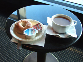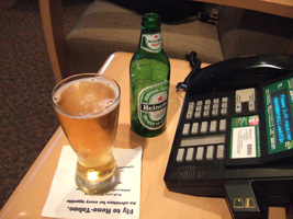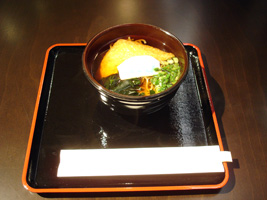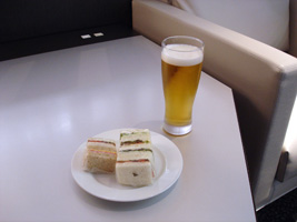 | NHのラウンジには飲みのも十分、食べ物十分、小間使い十分。大売出しのヌードルバーも日本語のみの対応、日本の常識的対応、まっすぐなほどの日本人の民族を前面に押し出したサービスには拍手喝采です。 「この番号札を持っていってください」(意味がわからなくても普通受け取る) 「2番の方どうぞ」(そんな日本語は理解できないので近くにいた人は頼んでいた人であってもなくても蕎麦を受け取る) 「番号札は?2番2番」(理解など出来るわけがないが、蕎麦は受け取ったので去っていく) 延々と待つ最初の注文者が怒る→小間使いがやってくる→全員が納得しないで場は収まる→歴史は繰り返す(頻繁に)そしてとっくに番号札2番を受け取っていた筆者は笑いをこらえ蕎麦をすする。ブルズルゥ〜ッピ。 で、味はちょっと甘めであるがいける。問題なし。 |