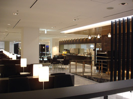 | 出国審査後左へ。左は第5サテライト。右はそれ以外サテライト。この時間は人がいないねぇ〜。いくつか店はあるがこれが仲見世か?なんか違うよな。コンコース(サテライト?)の端まで行くとちょっと広い空間があって、その先のゲートに近づくとなんとたばこ臭いこと。 ちょっと離れてコンコースの移動と。地上階からバスでも移動できるし、地下から歩いても行ける。時間は5分くらいだな。第4サテライトに着いてエスカレータを上がると目の前にNHのラウンジ登場。ともかく突撃じゃ。「あの〜何をお出しすればいいのでしょう?」「ラウンジ招待券はありますでしょうか」「無い」すかさずウォレットを広げると搭乗券をすっぱ抜かれスキャン。これでOK。 |
