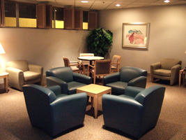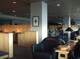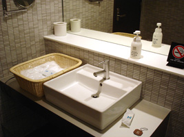 | なんか日本的モダンな安全なデザインと色使いね。(でも違和感)ぐるりと一周したけど開放感は無い。天井も低い。地上階だからかな?この上がファーストラウンジ?(まだ行ってません見てません) ソファーのコーナーのテーブル(巨大マリモがあるところ)にコンセントとEthernetソケットがある。ちっケーブル持ってないぜ。ということで無線でチェック。 最近は珍しくなった「俺のメールチェックしてくれ」電話オヤジも何人かいたのには驚いたが、アジア文化圏の時の流れは遅いので仕方ないであろう。 |