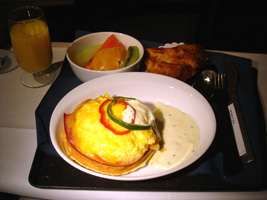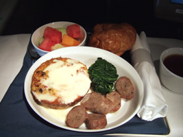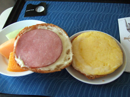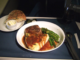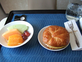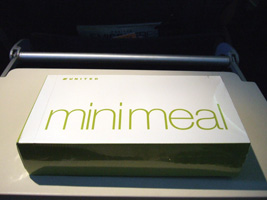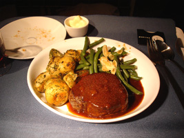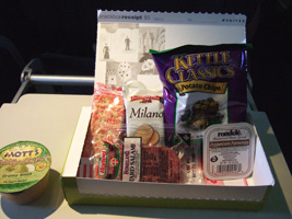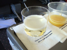 | 食事は$5です。高いんだか安いんだか....。珍しく白ワインを2本ほどチョイス。ほとんどここでしか使えない1Kに来るアルコールのバウチャー。一昨昨年の残りももうすぐ無くなります。この白ワイン、意外と美味しかったぞ。 |