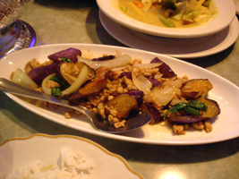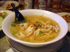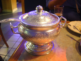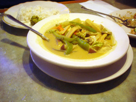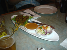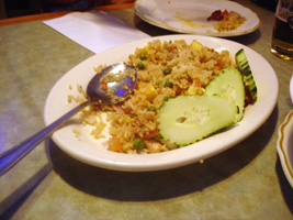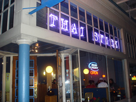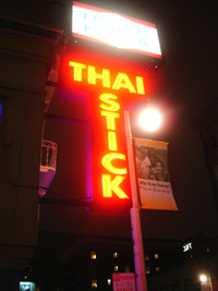 | 夜は「THAI STICK」(チェーンですな)に行ったが拍子抜けのタイ料理だった。HOTにしないと何とも味気無い。しか〜し、妙に銀色銀色している物体発見。中には米じゃ。第1の予想は「シャザーン」が出てくるはずだった。第2予想の「あくびちゃん」だったら。「あくびちゃん」だったら持って帰るつもりだった。パパラパァ〜 |
