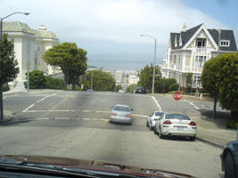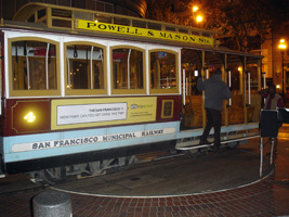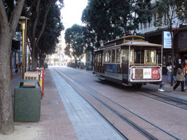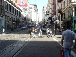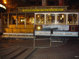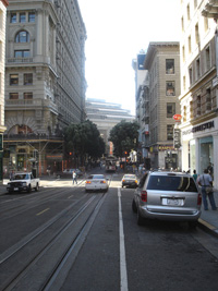 | HiltonからMoscone Center Westへの通学路の途中のパウエル通り。(上から・下から・真中から) 去年もレポートしたし、どこにでも載っているし、凄く有名だけど、ここがケーブルカーの発着所。おやじが一人で方向転換します。完全人力。(動画付き) |