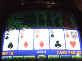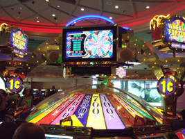 | Flamingoに行ったらでっかいWheel of Fortuneの¢1デノミのマシンがあった。客寄せにはいいかもね。一応ジャックポッドで$600Mオーバーだし。でだ(c)大熊猫。今回は出来ればTotalRewardsのプラチナを狙うつもりだったが、Bally'sのバーでちょっといいもの発見。ビデオポーカーなのだが最初は気が付かなかったが下の方に「DOUBLE UP」が....。前からあったっけ? これがあると無いとじゃギャンブル性が全く違うんですけど。こうなるとJack or Betterでも5回連続だと$1.25×32=$40にもなる。他のビデオポーカーマシンには無いようである。ふむふむ。 |