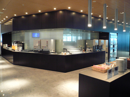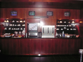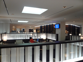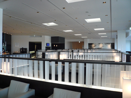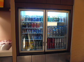| と言うことで、残席1を期待しつつ初めて利用するサテライト5の全日空のラウンジへ。 広くていいですね〜。入口を入って左右に分かれます。左はインサイドビューで右に行くとターミナルビューです。4サテライトの方は穴蔵っぽいのだが、こっちは広々。 空港の敷地内に邪魔な物が見えますが、この問題があっと言う間に解決することを願いつつ、ビールです。流石極東地区です。食べ物も充実しています。今回はSAKE Barを利用してみました。バーと言っても日本酒が並んでいるだけです。小さめのぐい飲みはありません。トーテムポールみたいな陶器のコップ?でちょこっと試飲です。うむ、酔いました....。 そうそう、垂幕の内側を覗いてみました。なんとマッサージマシン群とソファー群です。誰でも自由に使えます。でも壊れてました。 |
