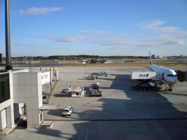 | 普段はTCATからリムジンバスで成田まで行くのだが、丁度NYCに行く知人がいたので車で行くことにした。一人だと片道4500円+雑誌代(運転するから雑誌はいらない)=往復で約1万円かかるのだが、成田近辺のパーキングサービスだと10日間で7800円+高速代5000円+ガス2000円?=15000円位なので二人の場合はお得である。家から車で出発、近くで知人を拾い、成田のパーキング屋にクルマを駐めてお金を払いボロバスでターミナルへ。帰りはターミナルのカーブサイドまで車を持ってきてくれる。(何故か野菜付き)これ便利。 |
