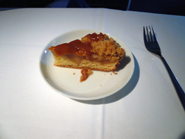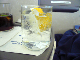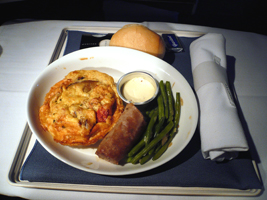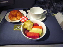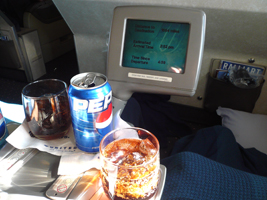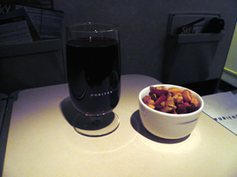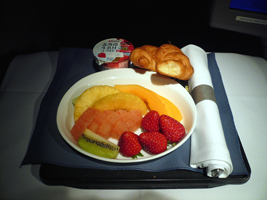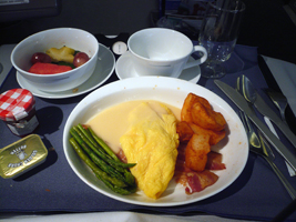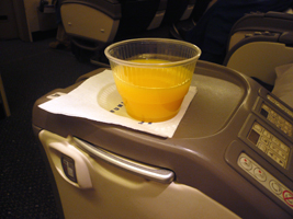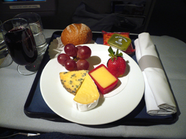 | 11Fを確保しています。NRT-SFOは貴重な9Aをぶんどりました。オレンジジュースと7upで糖分を高め朝食です。到着前はチーズをチョイス。カピカピでありました。 |