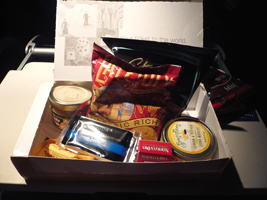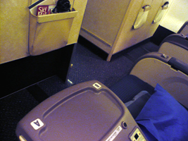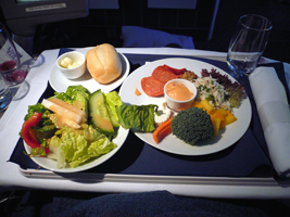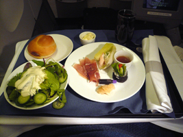 | 久しぶりの席です。フットレストを最大に引き出しても余裕です。 ディナーの前菜は蟹が一杯です。危ない危ない。食べると体が反応して倍にふくれます。ほぼ3日は死の境です。でも一番好きな食べ物は毛ガニの卵です。1週間何もなければ食べます。 |