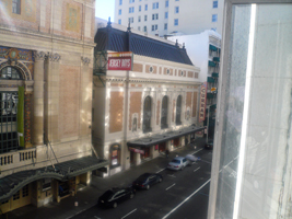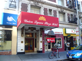 | SFOからダウンタウンまではタクシーです。贅沢します。ホテルはUnion Square Plaza Hotelです。意外に十分でやんす。ネットワークは窓際から近くの無料を盗波します。でも十分よ。狭いがバスタブもあるし。 しかしだ、寒い。すっごく寒い。天気図を見てわかったのだが、全米に大寒波だそうである。こりゃ寒いわ。 |