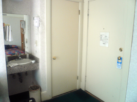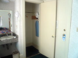 | ちょっと洗面台の横のドアが気になったのだが、下を見ると怪しげな疲れ方をしているので怖かったのだが、勇気を出して開けてみたらクローゼットだった。 |