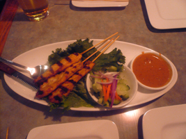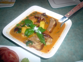 | 翌日は寝坊ついでにMacWorldExpoで、夜はまたまたMacWorldExpoにいた知合いがタイ料理に行きたいというのでお供したが、既に跡形もなく、あまりの寒さに近くのTHAI STICKに駆け込んだ。今回はちゃんと「辛いのね」って頼みました。アヒルのカレーを辛くしてみたが、そりゃからいがかなり美味かった。 |
