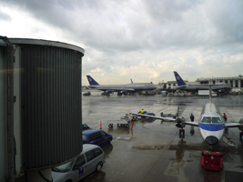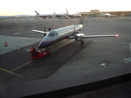 | 修行です。RCCから窓の外を見ていたのだが、1機のEMB120(かな?)が入ってきて、なにやら見慣れぬ橋が。これは車いす用のボーディングブリッジでしたね。これで一人搭乗なさいまして、PAXはその方だけで飛び立っていきました。 |