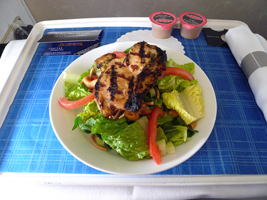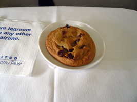 | ORDまではA320です。朝食はチキンサラダを頂きました。今度のチョコチップクッキーは暖かくて美味しゅうございました。 |