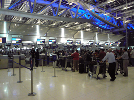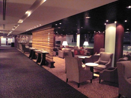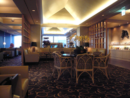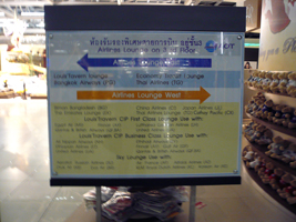 | さてさて、バンコクスワンナプーム空港から出発です。RCCが無くなったBKKでありますが、チェックインを終え出国するとなにやら看板が。「TGのラウンジは左ね」「その他の航空会社のラウンジは右ね」で、空港の見取図(って言うのか?)はここを参考にしてもらうとして、UAでチェックインすると左右にD1〜D8まで広がる横に長〜〜いコンコースDの真中から出国することになる。「その他の航空会社のラウンジは右ね」はコンコースDを越えコンコースEFGまで行かなければならない。ここにビジネスクラスの共有ラウンジとファーストクラスの共有ラウンジと個別の航空会社のラウンジがある。UAの発着は右に行ったD1〜4であるからして、また戻ってこなければならない。感覚的に成田ターミナル1のサテライト3の端から端をオートウォークを使わない(事実ちょっとしかない)で歩くようなもんだね。これは疲れる。(後の情報で左に行ったコンコースAにもあるようだ) 結局コンコースD1〜D4の平行してあるTGのラウンジを利用することにした。出国したレベル4から一つ下がったところにあります。ゲートから丸見え。(是非、人間目人科の看板が欲しいところです)看板通りに入ると実はRoyal Silk Loungeでありまして、Royal First Loungeは更に右まで行きます。なんのことはない、もう少し先からの入口もあると。 行ったのはラウンジa&bなのだが、その他の物がどうなっているのかよくわからん。案内もあるのかどうかよくわからん。結局アジアは不便じゃ。この合理性の飽くなき欠如はどうにかならんものか? |