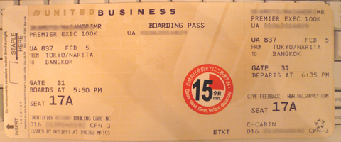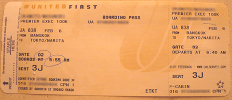 | 全く予定が無いわけであるが、ともかくBKKループを先延ばしにするべく考えてみたが、なんだこの為替は....有効期限の長いものでUAに限ると安い物で公示運賃で36840バーツである。ちょっと前だと感覚的に11万円以内ということだが、今は凄いぞ。3.74を掛けましょう。約14万円である。更に燃料が高いだの、空港はただで利用できると思うなよだの、入国審査は金がかかるんだぞだの、お前の安全を建て前で守るのも大変なんだぞだの、途中で遊ぶなら手数料巻き上げてやるだの言われて更に4万円ってところでしょうか?どのチケットをチョイスしても10万円以内なんて有り得ない。 ちなみに前年度20万円だったチケットは現在33万円である。やっていられません。と言うことで....。 折角だからBKKには行きます。2泊はしません。(これも昔ならせいぜい2万円なのが、今だと5万円)タッチします。空港近くのホテルでタッチです。 戻りは無料航空券を40時間前発券です。たった4万マイルなのでファーストクラスにしてみました。なんと!これが人生初めての国際線ファーストクラス。(アジアだが....実は昔UAで747-100のNRT-HNLのビジネスクラスに搭乗したことがありますが、ボーディングチケットは「F」となってました。ゴミ「F」です。ビジネスクラスとしてもゴミ「C」です。 |