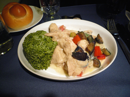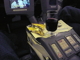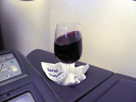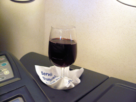 | 離陸してしばらくは揺れた。 フレンチレッドを頼みました。ワイングラスもご立派です。いいね〜いいよいいよ、いいね〜。これはいい。 食事のメニューもビジネスクラスより大きいぞ。内容は同じだな....。 |
