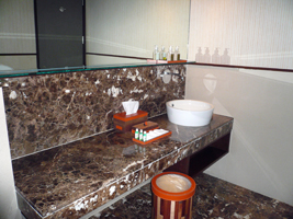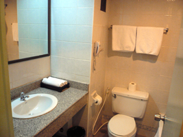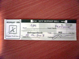 | まずはチェックイン。モハメッド・アリがお出迎えしてくれます。鍵の保証金として200バーツを持って行かれます。食事券を頂きましたが残念ながらオープン時にはホテルにはいません。 小奇麗ですが、何かアクションがあると小さな生き物の驚きが見られます。ダニでしょうか...。鍵を机に置くとチロチロ。蛇口を捻るとチロチロ。冷蔵庫は我が家のよりでかいぞ。 浴室の蛇口を捻ると玄関先で「カタン」と音がします。そうです電熱線で水を温めてお湯にするような仕掛けの付いた部屋だったのです。素晴らしきカルノー機関です。冷たい水はちゃんと室温になります。水流も勢いはありませんが頑張っています。努力を認めてあげましょう。全体的に旧バンコク・ドンムアン空港のデイルームが一枚上手です。 では何故今回デイルームを使わなかったのか? 何も知らなかったからです。一応入国したかったというのもありました。デイルームがあるだろう事は想像していましたが、外か中かわからなかったというのがある。(でも普通は制限区域内だよな)いつか、またバンコクに来るときまで取っておきましょう。 |