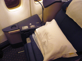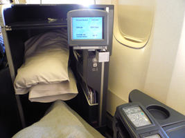 | 食事が終るとやはり寝ちゃいます。ぐっすりと....。ビジネスクラスだと起きちゃうこともありますが、ファーストクラスはすやすや〜。やはり寝るのはシートよりベッドです。いいね〜いいよいいよ、いいね〜。これはいい。 |