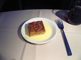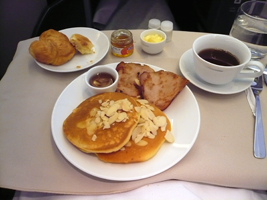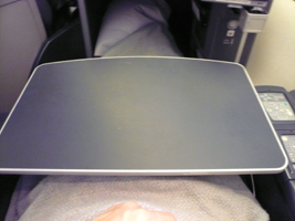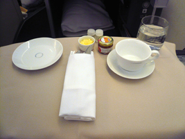 | テーブルを引き出すと巨大です。途中で突っ掛ってしまった。食事もトレー無しでワゴンからサーブしてくれます。いいね〜いいよいいよ、いいね〜。これはいい。シート配置のおかげでワゴンの移動がちょっと大変な気がする。マーマレードも小瓶です。(あ゛アジア線はビジネスでもそうか) 淡いサーモンピンクのクロスもいい感じです。写真を撮るのも広角レンズの威力発揮です。 |