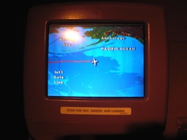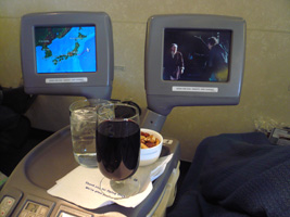 | 搭乗率はY50%、C満席-1席、F100%。自分の横だけ空いている。らっき〜♪ ツインモニターで出発。お食事はヒヨコの大人を頂きました。新メニューの茶巾(巾着?)寿司がうまい。映画が不思議です。いつもの全男役を一人の声優が、全女役を一人の女性が吹き替えている映画が無いようです。いいことです。同じ声だと進行がわからなくなるのよね、真剣に見てないから。 |