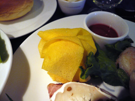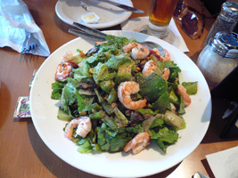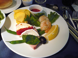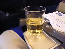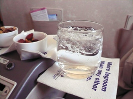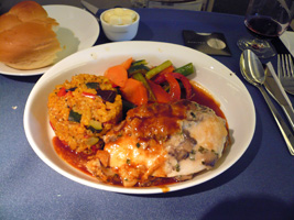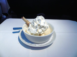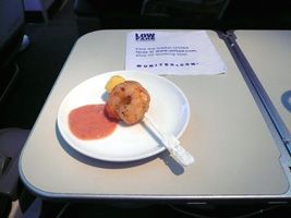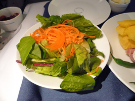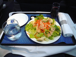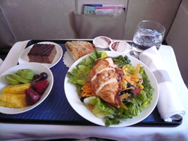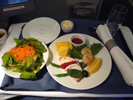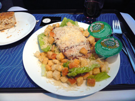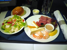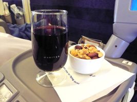 | まずは妙に新しいプラスチックのグラスでウェルカムスパークリングワインです。お食事前にはいつもの通り赤ワインを頂き、おや?アペタイザーにこんな海老さんと鳥さんナゲットが登場。(TGかと思ったわ)メインはなんと3種類チキンサラダと肉と魚から選べます。これってこの時間(夕方便)だから?それともLHR-LAXの流れだから?チキンサラダを選んだところ、チキンサラダの前にチキンサラダが出ていらっしゃいました。デザートのアイスクリムも美味しゅうございます。 |
