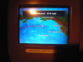 | 問題のLAX-HNLが近いです。 チェックインで「HNL行きの順番はあなた26番目よ」「は?」全米+ヨーロッパからそんなに豪快な方達がお集まりになっている?まさか....また宗教絡みの集団移動か....。美味しいお布施で幹部ががっちり? LAS-LAXはモノクラス、LAX-HNLはボーディングパスはエコノミーしか持っていないのでファーストクラスセキュリティーのおばちゃんにはじかれる。仕方なく一般の部に参加したところ15分で抜けました。 ここで一休み最近Bluetoothの補聴器タイプのヘッドセットで携帯電話を使っている輩が多い。声がでかいんじゃぁ〜。しかもそう言う奴らは着陸した途端に電源を入れ、電話をかけ始める。愛か?愛なのか?そんなに通話してないと死ぬのか?飛行中は我慢しているだけなのか?煙草より中毒症状が重くなるものなのか? |