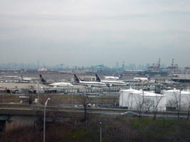 | 翌朝、窓から近くにニューアーク空港が見えます。近くて遠いマンハッタンも見えます。マンハッタンにお酒を飲みに行けるのは何時のことでしょう? |