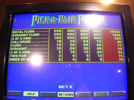 | 気にも止めなかったのだが...。なんか妙なマシンを発見。Pick'em?違う....。手役はストレートフラッシュが1199じゃなくて1000である。ロイヤルフラッシュがなんと10000。これってコンプにいいマシンではないのか?ちょっとやってみたが流石にギャンブル性が高いですね。いいかも....。ちなみにBally'sに2台、harrahsに2台確認。 |