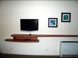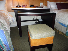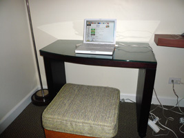| センターテーブルを引き出すとデスクになるのでこれを使ってミニオフィス作成。ついでにLANケーブルとモジュラーケーブルを延長してケーブルが邪魔にならないように部屋の隅に這わす。 |