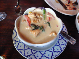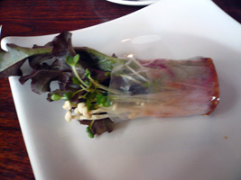 | タイ料理のSingha Thai Cuisineです。未だに何をもってタイ料理というのかわかりませんが、まぁまぁのお味。もうちょっとHOTでも良かったかも。マグロの春巻きは4本中3本に手を付けたときに撮影。決して1本だけぽつんと出てくるわけではありません。 |