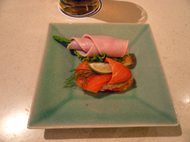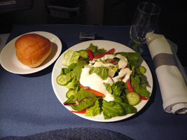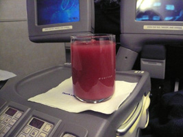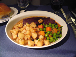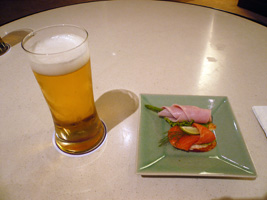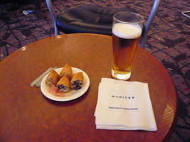 | あまりに下らないことに時間を取られたので今回はRCCに直行。ビールとおつまみと最終メールチェックをして搭乗開始。UA803のビジネスクラスは空きが1席。ミールはTRADER VIC'Sです。牛さんをチョイスしてみましたが、懐かしのマーティン・ヤンシェフに近づいています。かなり....。 |