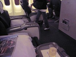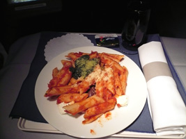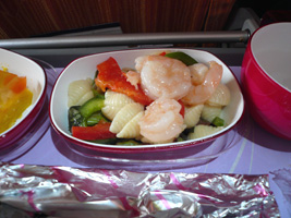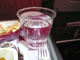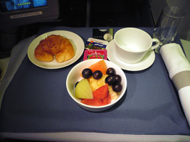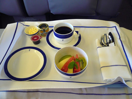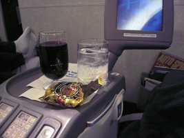 | さて、ちゃんとしたミールが出るようです。エコノミーだからしてそれなりではあるが、よっぽどUAの長距離線よりまともかどうかは別にしてしっかりしています。そもそもトレーの大きさが違う。食器は容量は底上げっぽく作られているが十分だし、デザインも中々良い。きちんとガラスのワイングラスも付いているしプラスチックのコップで水がサーブされます。UAのエコノミーはパックの水だっけ?ワインも白と赤をフルボトルで"マメ"サーブしてくれます。これ重要。 思い出してみると国際線のエコノミーは2007年1回、2006〜2003は0回、2002年は2回、2001年は0回、2000年は3回、1999年は2回、1998年は4回、1997年は6回の合計18回である。それ以前はJLのエコノミーツアーユーザー。 |