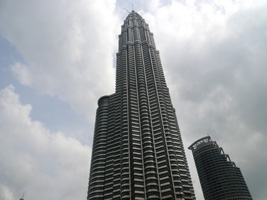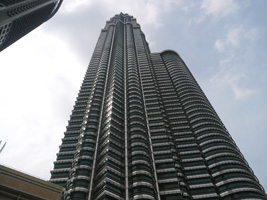 | まずはKL SentralからPutra LRTでKLCCに向いましょう。地上に出るとすぐにそびえ立つPetronas Twin Towerは近すぎて頂上が見えません。展望台まで登ろうとしたが混んでいる。 |