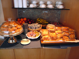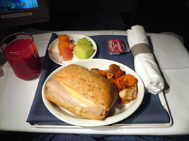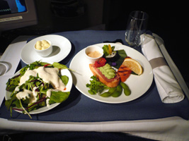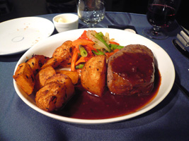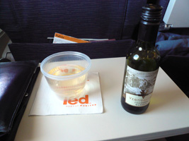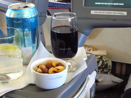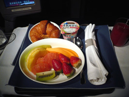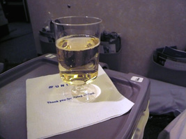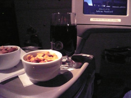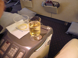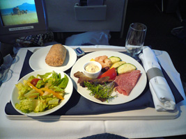 | 後部座席ではお年寄りの男女が新しい出会いに花を咲かせています。どうでもいいが声が大きい。本日の機内は設定温度が低くされているために隣の女性は毛布3枚掛けです。右前方ではザ・タッチのおすぎとピーコが会話しています。通路に立つなっていうの「邪魔だ」と、言ってあげました。相変わらず何も見えない洋上飛行なのに窓を開ける馬鹿がいる。左方向ではアングロサクソンの父娘が....。と、人間ウォッチングも程々に食事の時間です。 最近の傾向として「中国語は話せるが日本語は話せないアジア人CAは雑なくせに動作も鈍くフレンドリーじゃない」というの流行ってきていると感じる今日この頃です。 |