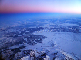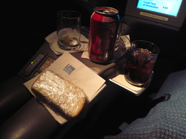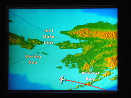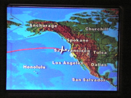 | ここ最近のUAのエンターテイメント政策は貧しい物です。ビデオも殆ど見尽くして暇なのでカロリーの補給です。サンドイッチとコーラを頂きましょう。ついでにがっぽりチョコレートも食べてしまった。 ところで、何時もこんなにアラスカ寄り飛んだっけ? |