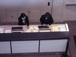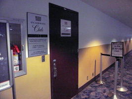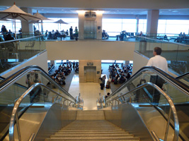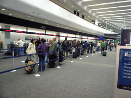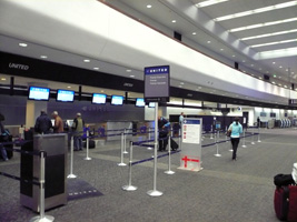 | SFOに到着しました。さて、朝の混乱を見てみましょう。と、チェックインカウンターに向ったのだが、空いてます。なんと混んでいるのは赤い看板(GSM、F、1K)のカウンターだけです。セキュリティーも赤い看板のところだけ混んでいる。灰色の看板(Premier)はガ〜ラガラ。通常エコノミーも空いています。セキュリティーも混んでいるのは赤い看板のところだけ。それでもそこに並ぶ階級社会人。国際線ターミナル側のセキュリティーに至っては誰もいません。(単に早すぎたのか?) |