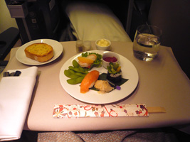 | SIN-NRT予定フライト時間は6時間5分。この時間でミールは2食出ます。NRT-BKKは7時間10分で1食です。ま、1食でも十分でございますよ。 途中、ご老人が気分悪くなったとか言って酸素吸入をされてましたね。空いていたから良かったものを、混んでいたらギャレーか? |