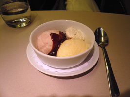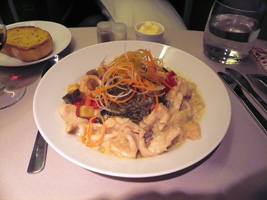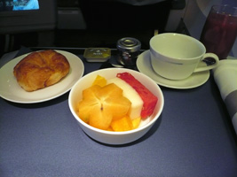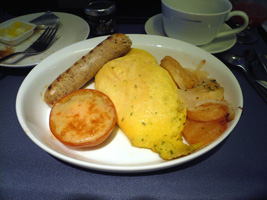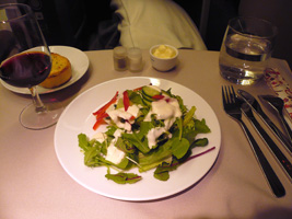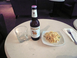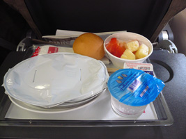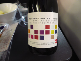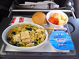 | ミールも出ます。カートの半分を赤ワインが占めてるぞ。よくわからないがオーストラリアワインです。ミールの選択は「食うか・食わないか」です。これはなんだ?鳥焼きそばかな? |