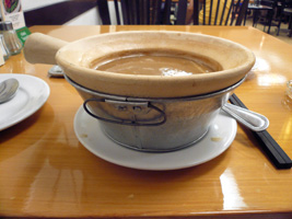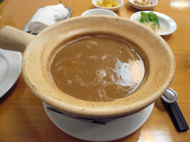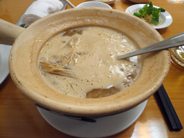 | 連れはダウンしているが無視してフカヒレを食しに行ったのだが、まずい!高い!日本人が多かった(と、いうか日本人だけ)ので不安だったが、後でトラベルガイドにを見たらしっかり載っていました。こりゃだめだ。フカヒレのスープは下からTHB600-800-1000-1200である。日本人なので最高の一つ下を頼んだが泡だらけ....フカヒレちょろちょろ。これで4000円。泡をすくって食べたわよ。やっぱりサイアムの方へ行けば良かった。 |