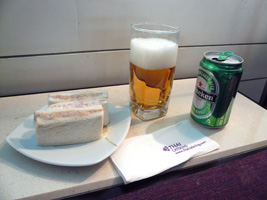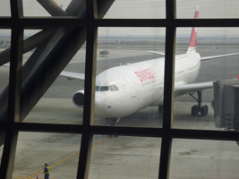 | 折角なので(別にそう言うわけではないが)TGのビジネスクラスラウンジへ。ビジネスラウンジは今回が初めて。以前の2回はファーストなんだよぉ〜。やはりファーストとは違います。個室ではないのは良いとして、街の喧騒が持ち込まれています。 ゲートに行くとまだZRHから機材が到着していません。暫くするとA340-300が登場。 |