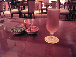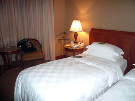 | 到着は夜です。ホテルはSheraton Towers Singapore。Newton駅近くですな。予約で2 Bedで喫煙を予約しているのに無いときやがる。散々探して貰って部屋に行くとでかいベッドが一つ。ベルと笑いながら代えてもらうが無いらしい。しょうがないので「禁煙ルーム」になりました。全く問題なし。 やりかけた仕事があるのでバーでビールを飲みながらiBookG4。 |