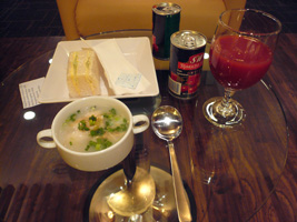 | SINの共有ラウンジは一応Wi-Fiは来ているのだが、ブチブチに切れるので使えねぇ。おかゆをすすりトマトジュースで搭乗です。 |